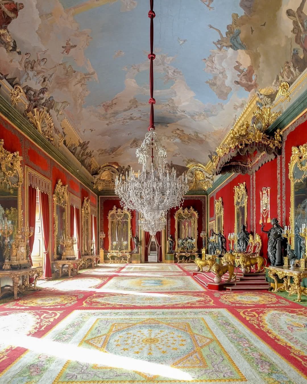 Los nuevos reyes Borbones querían reproducir el lujo al que estaban acostumbrados en Versalles. También destacan las pinturas al fresco de sus techos, elaboradas por tres de los mejores pintores de frescos de la historia del arte: el napolitano Luca Giordano, el veneciano Giambattista Tiepolo y el alemán Antonio Rafael Mengs. No hay visitante que no quede asombrado.